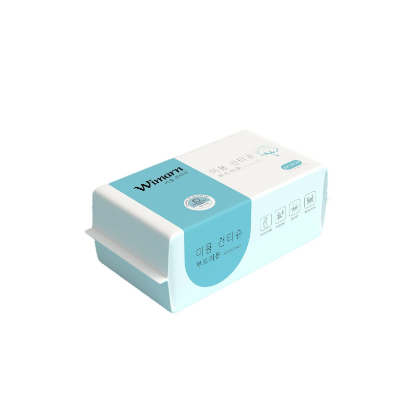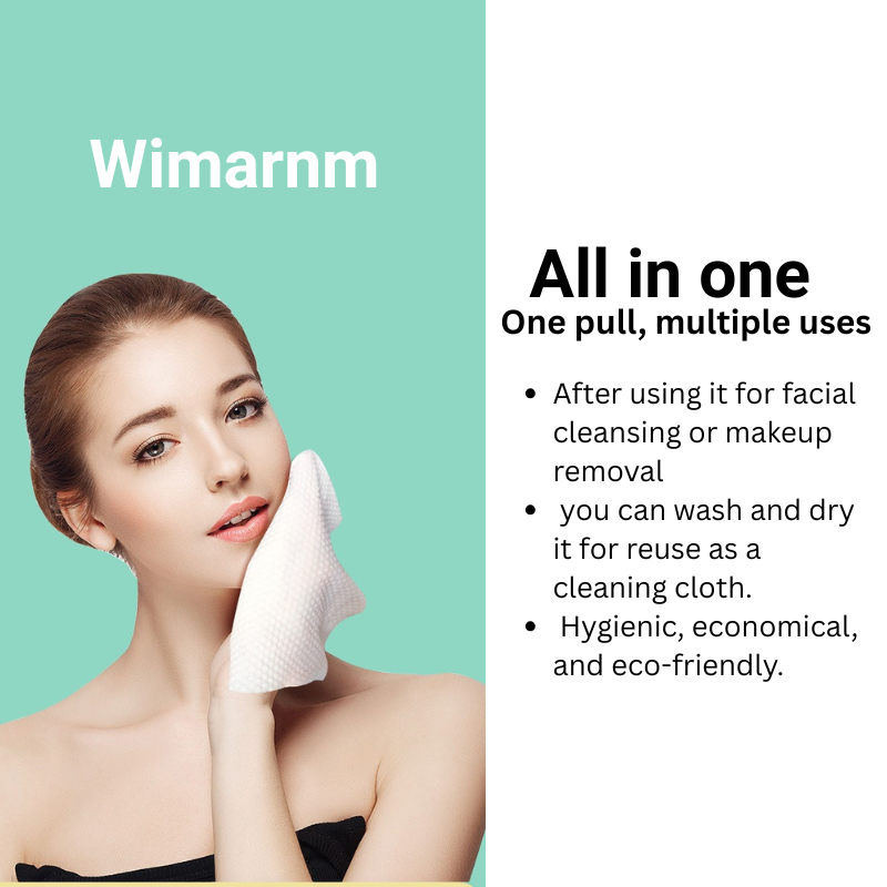 Wimarn Makeup Removal Cotton Tissue is a thickened, cotton-fiber disposable towel designed for cleansing, makeup removal, and general hygiene use. It supports both dry and wet applications and is made with a soft, durable, and tear-resistant 3D water-jet woven structure. Each sheet is dispensed one at a time to prevent sticking and waste. The material can be washed and reused for secondary household cleaning. No fluorescent agents are added.